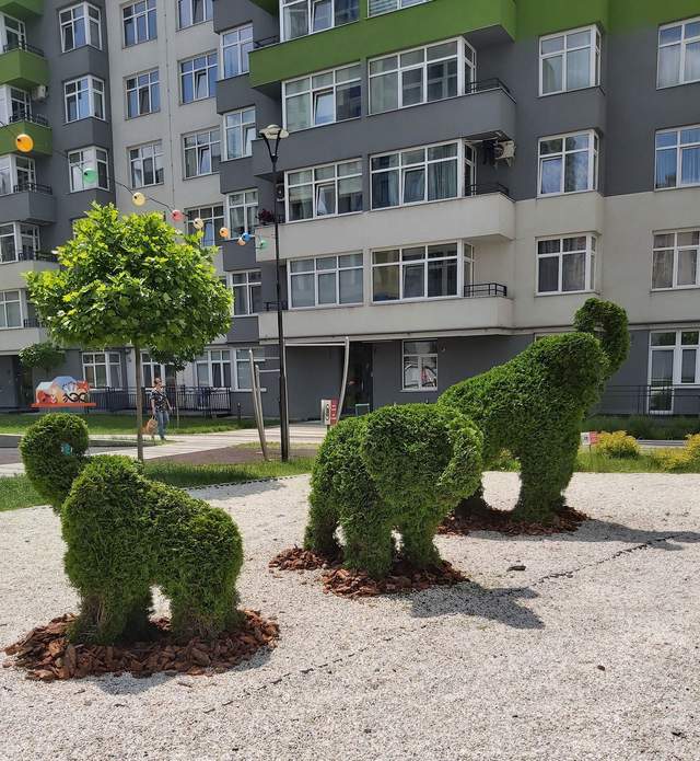 Объединившись, жители превратили территорию своего жилищного комплекса в невероятный сад с топиарными фигурами. В них здесь обитают слоны и динозавры, растут целые аллеи дубов и японских церсисов. А недавно еще и высадили 400 луковиц крокусов. Словом, невероятная красота! Можно себе представить, как здесь будет хорошо, когда это все разрастется и забуяет.