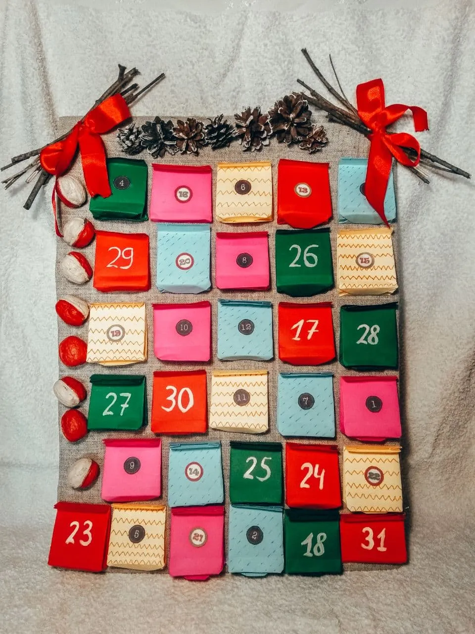 Це цікаве декорування може бути й окремим новорічним подарунком родичам або друзям. Адвент-календар може бути різним: у вигляді пряникового будиночка, місяця з зірочками, ялинки, валізи або цікавого, яскравого календаря. Дошку для малювання можна вкрити канвою, закріплюючи з задньої сторони скотчем. З двостороннього кольорового паперу потрібно вирізати 31 макет пакунків (17,5 сантиметра на 9,5 сантиметра). За бажанням, на кожному пакунку можна намалювати орнамент та обов'язково пронумерувати від 1 до 31. Склеєні пакети зафіксувати на дошці в хаотичній послідовності. У кожний пакунок покладіть мініподарунок (цукерки, цукати, печиво, побажання, ювелірні прикраси, завдання тощо). Зверху дошку можна декорувати атласними бантами, різдвяними фотографіями, новорічним надписом, шишками.